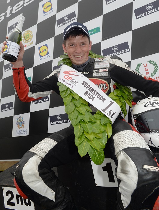 PACEMAKER, BELFAST, 16/8/2014: Dan Kneen (Cookstown Burrows Suzuki) celebrates winning the Superstock race at the Ulster Grand Prix at Dundrod today.