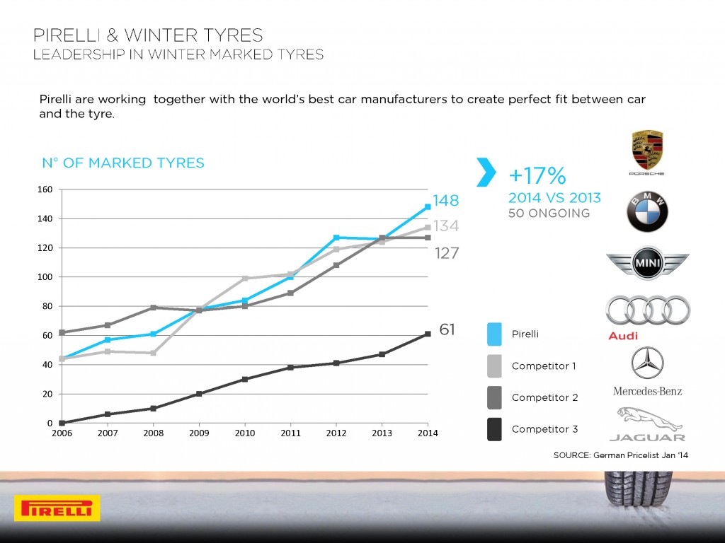 Tuttavia, anche prima di questo aumento, Pirelli può rivendicare il titolo di leader mondiale nel settore dei pneumatici invernali marcati per le case di prestigio. Per esempio, il 100% di tutti i pneumatici invernali per Lamborghini e Maserati sono realizzati da Pirelli. Per la Ferrari, la cifra è del 90%, per Bentley 77%, per Porsche 76% e per Aston Martin il 67%.
