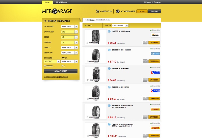 Registrandosi su www.web-garage.it si può accedere sia all’e-commerce gomme che al preventivatore di tagliandi ed usufruire di sconti e promozioni riservati agli iscritti.