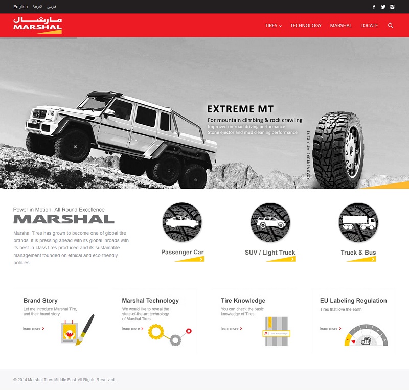 Il nuovo sito è disponibile in inglese e in arabo, con un layout di facile utilizzo per una navigazione user-friendly e un’ottimizzazione specifica per i dispositivi mobili. Con dettagli completi dei prodotti disponibili nella regione e un dealer locator con i contatti del rivenditore più vicino, il sito renderà molto veloce ed intuitivo l’intero processo di ricerca di informazioni sui pneumatici Marshal per i clienti.