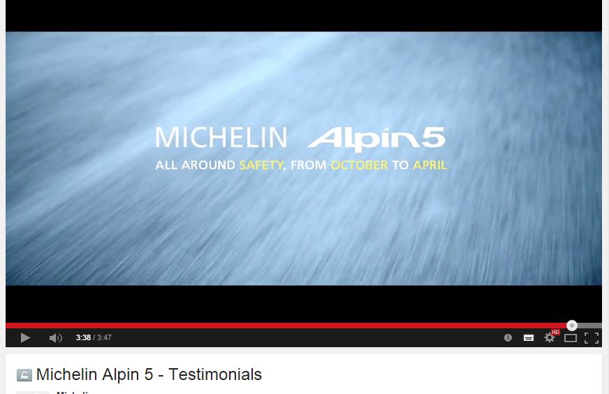 Michelin ha pubblicato sul suo canale Youtube un video, dal titolo “Michelin Alpin5 – Testimonial”, che presenta le testimonianze di alcuni automobilisti che hanno testato il nuovo Michelin Alpin5. I protagonisti del video parlano della loro esperienza con i nuovi pneumatici francesi, di come queste gomme si comportano in condizioni reali, guidate da persone reali: ci sono automobilisti che devono andare al lavoro, persone che hanno avuto un incidente a causa della strada ghiacciata, sciatori che si recano sulla neve per divertimento ed altre situazioni giornaliere. Secondo le testimonianze, la differenza è evidente e la senzazione trasmessa è quella di maggior sicurezza.