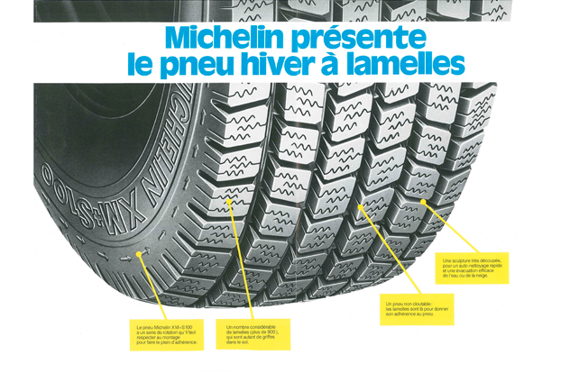 Già negli anni ‘30, l’azienda stava lavorando a un’idea per migliorare l’aderenza sul bagnato: le lamelle. Applicata da principio ai pneumatici estivi Michelin Stop nel 1934, Michelin Pilot nel 1937 e Michelin X nel 1949, questa nuova tecnologia è quindi declinata anche sui pneumatici invernali, con il lancio del modello Michelin Xh nel 1967. Questo pneumatico radiale poteva affrontare neve e ghiaccio, ma anche strade asciutte e bagnate. Le scanalature erano intagliate e presentavano ampi solchi per facilitare l’evacuazione della neve e i tasselli della parte centrale del battistrada aumentavano l’aderenza. Il modello Michelin Xh era così in grado di rispondere ai fattori contrastanti che influiscono sulla tenuta di strada in inverno.
