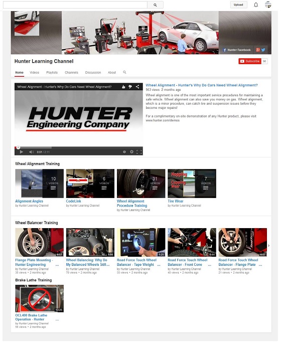 Le grandi aziende, sempre più spesso, utilizzano i social network per entrare in contatto con i propri clienti. Hunter Engineering ha fatto di più, presentando un canale di tecnica e di formazione su YouTube chiamato “Hunter Learning Channel”. Questo canale offre video di formazione per ogni categoria di prodotto fabbricato dalla società, in inglese. Il canale permette inoltre agli spettatori di inviare domande tecniche e di formazione direttamente sotto i video, ricevendo risposte dettagliate da parte del personale di Hunter.