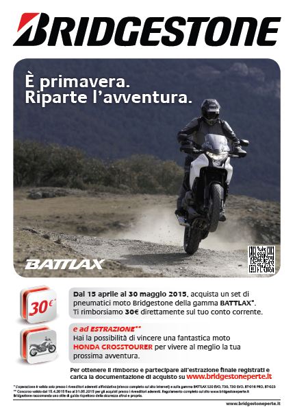 Con l’inizio della bella stagione si riaccende la voglia di mettersi in sella alla propria moto, ma prima di una nuova avventura il controllo e la sostituzione dei pneumatici è un passaggio necessario. Anche quest’anno Bridgestone lancia una nuova promozione per tutti coloro che scelgono i suoi pneumatici premium. Da mercoledì 15 aprile a sabato 30 maggio 2015 per ogni acquisto di un set della gamma Battlax S20 Evo, T30, T30 Evo, BT-016 Pro, BT-023 è previsto un rimborso di 30 euro. L’operazione è valida solo presso i rivenditori aderenti all’iniziativa, il cui elenco completo è disponibile online.
