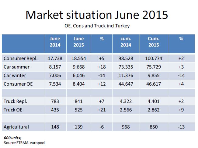 Con giugno si chiude anche il primo semestre del 2015 e, secondo le statistiche di ETRMA ed Europool, i mercati dell’equipaggiamento originale e del ricambio sono rimasti stabili in tutti i segmenti, consumer e truck. Fa eccezione il segmento agricoltura, che registra invece un trend negativo (-13%), in contrasto con le crescenti importazioni da Cina e India.