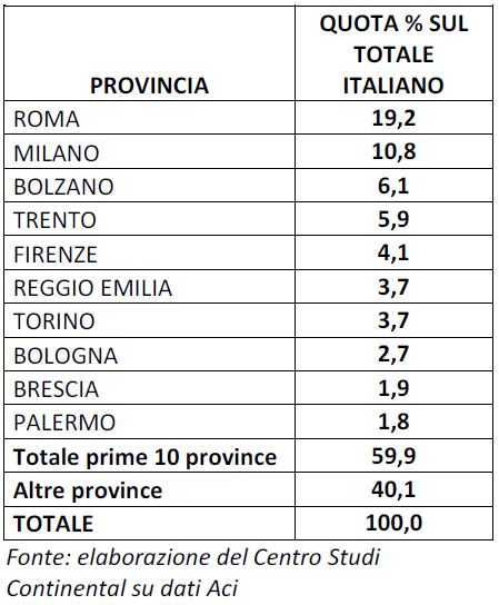 La classifica delle dieci province italiane in cui circolano più auto elettriche vede al secondo posto Milano (10,8%), e poi Bolzano (6,1%), Trento (5,9%), Firenze (4,1%), Reggio Emilia e Torino (3,7%), Bologna (2,7%), Brescia (1,9%) e Palermo (1,8%). Come si vede si tratta di province del centro nord Italia, con la sola eccezione di Palermo, che piazza al decimo posto. Altro particolare interessante da notare è che nelle prime dieci province in graduatoria circola circa il 60% del totale delle auto elettriche del nostro Paese.