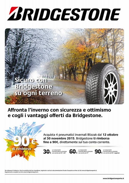 Per affrontare l’inverno con sicurezza ed ottimismo Bridgestone, produttore numero uno al mondo di pneumatici e prodotti in gomma, offre a tutti gli automobilisti un motivo in più per cambiare i pneumatici della propria auto: da lunedì 12 ottobre a venerdì 30 novembre 2015 tutti coloro che acquistano un set di pneumatici nuovi della gamma invernale Blizzak per auto, SUV o 4×4 e trasporto leggero, presso uno dei rivenditori aderenti all’iniziativa, possono ottenere fino a 90 € di rimborso direttamente sul proprio conto corrente.