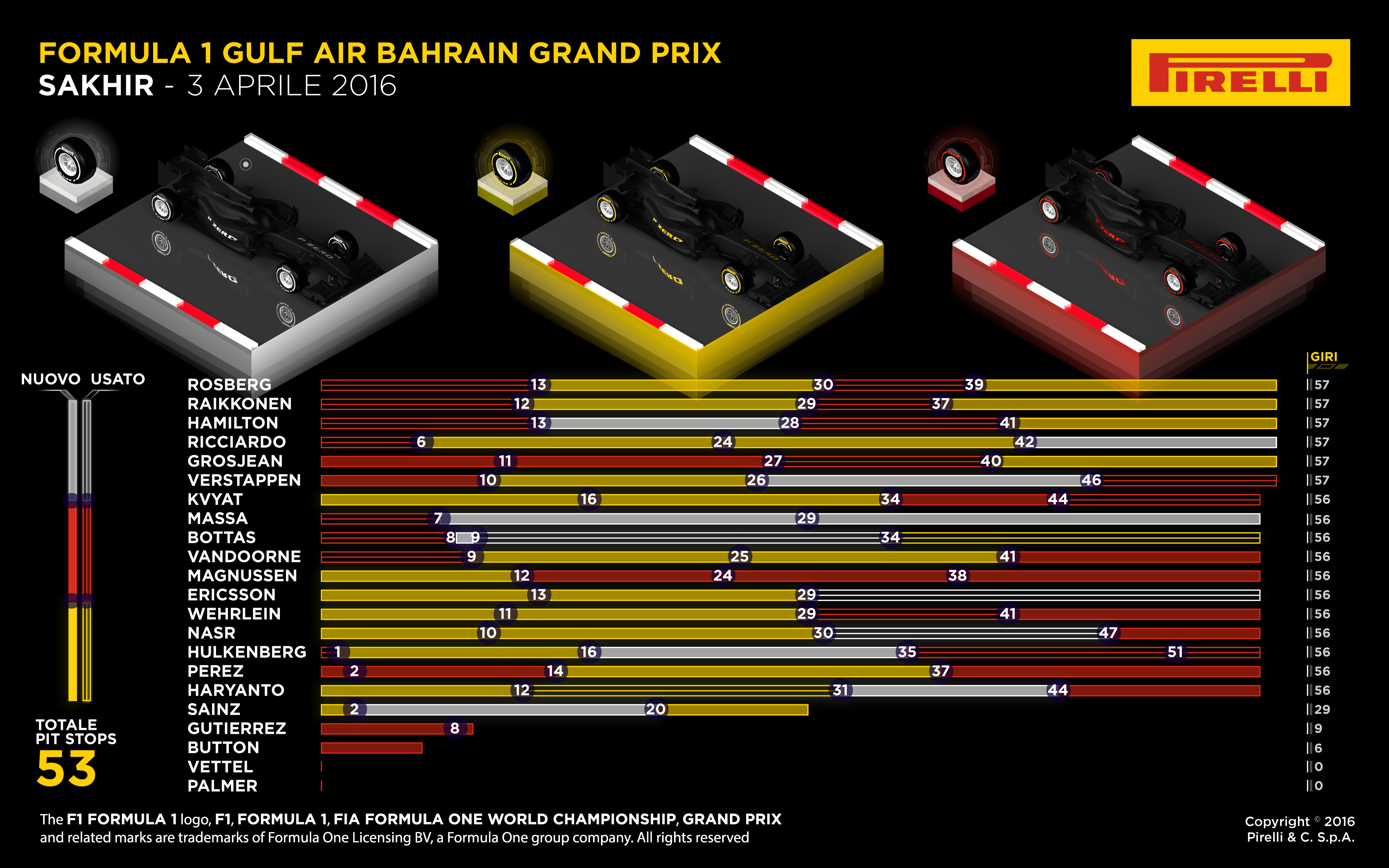 Due vittorie in due gare nel 2016 per il pilota della Mercedes Nico Rosberg, che in Bahrain ha usato una strategia su tre soste alternando stint con P Zero Red supersoft e P Zero Yellow soft: esattamente la stessa tattica utilizzata da Kimi Raikkonen, secondo su Ferrari. Lewis Hamilton ha chiuso terzo partendo dalla pole, montando le medie nel suo secondo stint, dopo un contatto al via. In totale, sono state nove le diverse strategie utilizzate dai primi 10, inclusa quella su due soste del pilota della Williams Felipe Massa.