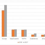 Il flusso verso Asia e Nordamerica ha registrato invece un rialzo più contenuto, nell’ordine del +4%. Va comunque ricordato che tali aree assorbono una quota considerevole dell’export italiano di settore: nel gennaio-marzo 2017, infatti, i mercati medio ed estremorientali (compresi quelli marginali dell’Oceania) nel loro complesso e l’aggregazione NAFTA hanno rappresentato ciascuno il 14% del totale.