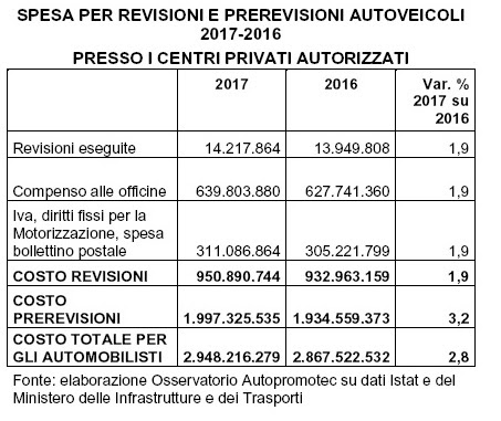 2,95 miliardi di euro. È questa la cifra che gli italiani hanno speso nel 2017 per far revisionare le loro auto presso le officine private autorizzate. Rispetto al 2016, quando la spesa per le revisioni ammontava a 2,86 miliardi di euro, vi è stato un aumento del 2,8%. La cifra di 2,95 miliardi per le revisioni nel 2017 comprende il pagamento della tariffa per le revisioni che ammonta a 950,9 milioni di euro (+1,9% rispetto al 2016) ed il costo per le cosiddette operazioni di prerevisione, cioè per le riparazioni necessarie per porre i veicoli in condizioni di superare i controlli, costo che ammonta a 1.997,3 milioni di euro (+3,2%). Queste stime derivano da un’elaborazione dell’Osservatorio Autopromotec (che è la struttura di ricerca di Autopromotec, la più specializzata rassegna internazionale delle attrezzature e dell’aftermarket automobilistico) su dati Istat e del Ministero delle Infrastrutture e dei Trasporti.