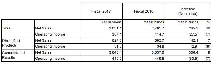 Di conseguenza, le vendite nette nel segmento pneumatici durante l’anno fiscale 2017 sono state pari a 3.031,1 miliardi di yen (22,46 miliardi di euro), con un aumento del 10% rispetto al 2016; il risultato operativo è stato di 387,1 miliardi di yen (2,867 miliardi di euro), con un calo del 7%, dovuto all’aumento dei costi delle materie prime.
