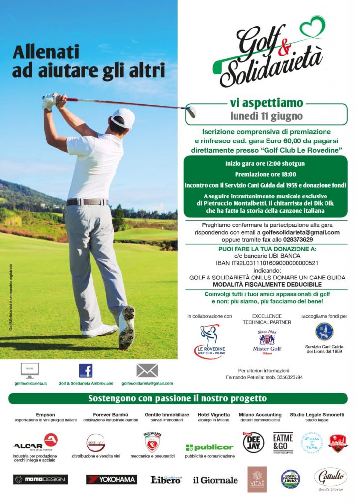 Quest’anno l’11 giugno è il giorno giusto per fare una buona azione divertendosi. Presso il Golf Club Le Rovedine di Opera, Milano, si terrà, a partire dalle ore 12:00 una gara di golf, seguita dalla premiazione alle ore 18:00. A seguire è prevista l’esibizione di Pietruccio Montalberti, chitarrista dei Dik Dik, nonché una delle pietre miliari della musica italiana. I fondi raccolti saranno devoluti a “Servizio Cani Guida dei Lions dal 1959”, che doneranno un cane guida.