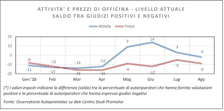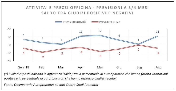 Dal Barometro emergono poi, oltre alla situazione attuale, anche il quadro previsionale per i prossimi 3/4 mesi. Per il volume di attività di autoriparazione, secondo i giudizi degli interpellati espressi in agosto, la tendenza che emerge è all’incremento. Il saldo è infatti positivo (+11), in crescita rispetto a luglio (+1) e a giugno (+6). Per i prezzi, viene confermata una tendenza alla diminuzione, come dimostra il saldo tra valutazioni positive e negative che si attesta a -4, pressochè in linea con la media del saldo fatta registrare nei mesi precedenti (-5).