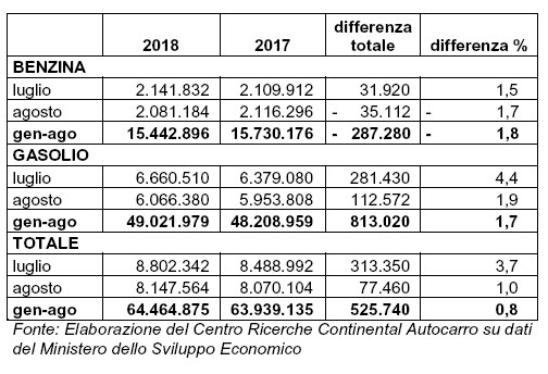 Nei primi otto mesi del 2018 le emissioni di CO2 derivate dall’uso di benzina e gasolio per autotrazione sono aumentate di 525.740 tonnellate rispetto allo stesso periodo del 2017. Tale aumento corrisponde ad una crescita percentuale dello 0,8%. Le emissioni derivate dall’uso di benzina per autotrazione sono diminuite di 287.280 tonnellate (-1,8%). Questa diminuzione è stata ampiamente compensata dalla crescita delle emissioni derivate dall’uso di gasolio per autotrazione, che hanno fatto registrare un aumento di 813.020 tonnellate, che corrispondono, in termini percentuali, ad un +1,7%. Questi dati derivano da un’elaborazione del Centro Ricerche Continental Autocarro su dati del Ministero dello Sviluppo Economico.