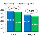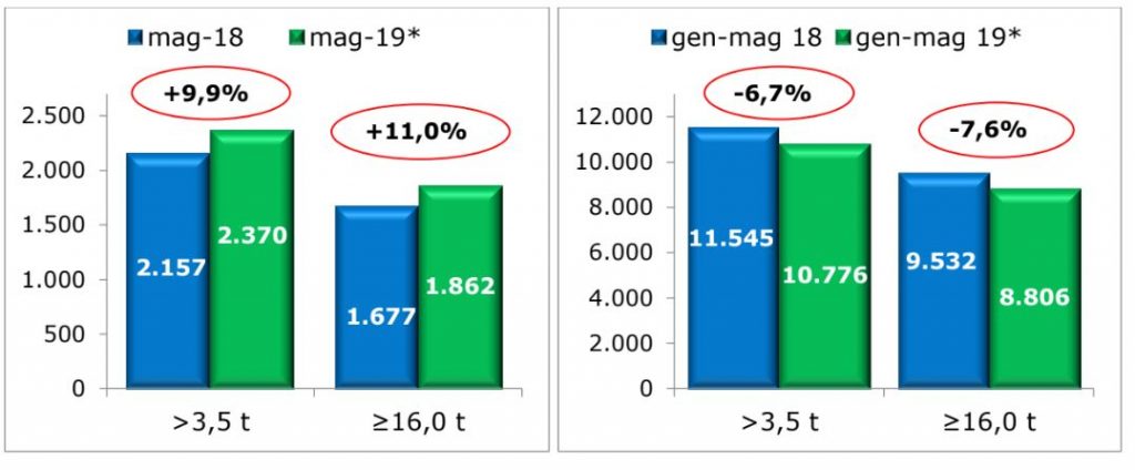 Nel comparto dei veicoli pesanti con massa totale a terra uguale o superiore a 16 t, l’andamento rilevato registra a maggio +11% rispetto al maggio 2018 (con 1.862 unità immatricolate contro 1.677) segnando un recupero ancora più evidente, per quanto anche qui la stima dei primi cinque mesi del 2019 rimanga negativa, con -7,6% sullo stesso periodo del 2018 (8.806 unità immatricolate contro 9.532).