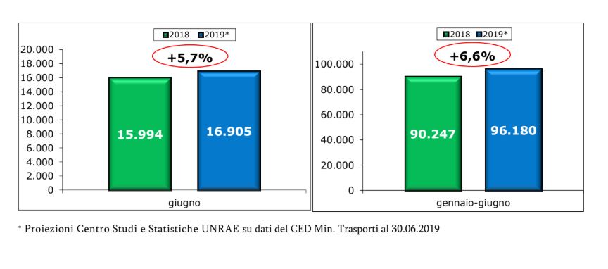 Arriva il giro di boa e in questa prima metà del 2019 si conferma positivo il mercato dei veicoli commerciali (autocarri con ptt fino a 3,5t). Secondo le stime diffuse dal Centro Studi e Statistiche UNRAE, le immatricolazioni del I semestre sono 96.180, in crescita del 6,6% rispetto alle 90.247 dello stesso periodo 2018. A contribuire, anche il mese di giugno appena concluso che con 16.905 vendite segna un incremento del 5,7% rispetto alle 15.994 del giugno 2018.