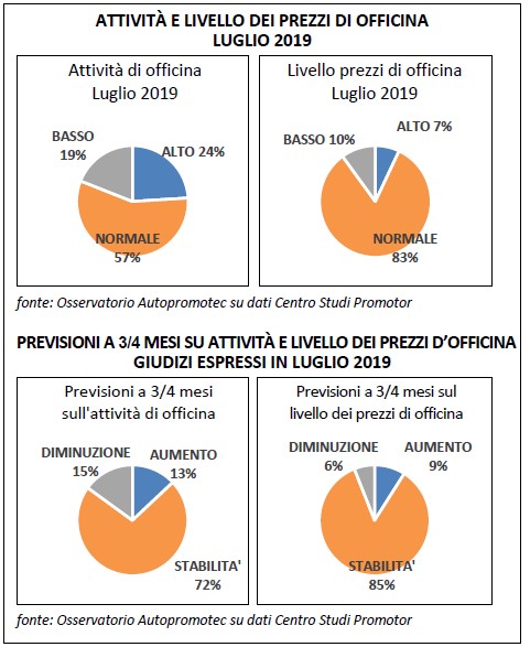 Il settore dell’assistenza auto in Italia registra in luglio un lieve aumento per l’attività delle officine di autoriparazione. È quanto emerge dal Barometro sul sentiment del settore dell’assistenza auto, barometro che è stato realizzato dall’Osservatorio Autopromotec sulla base di inchieste mensili condotte su campioni rappresentativi di officine di autoriparazione. Come mostra il grafico, in luglio gli autoriparatori che hanno giudicato alto il livello di attività di officina sono stati di più rispetto a coloro che hanno indicato un basso livello di attività (24% contro 19%).