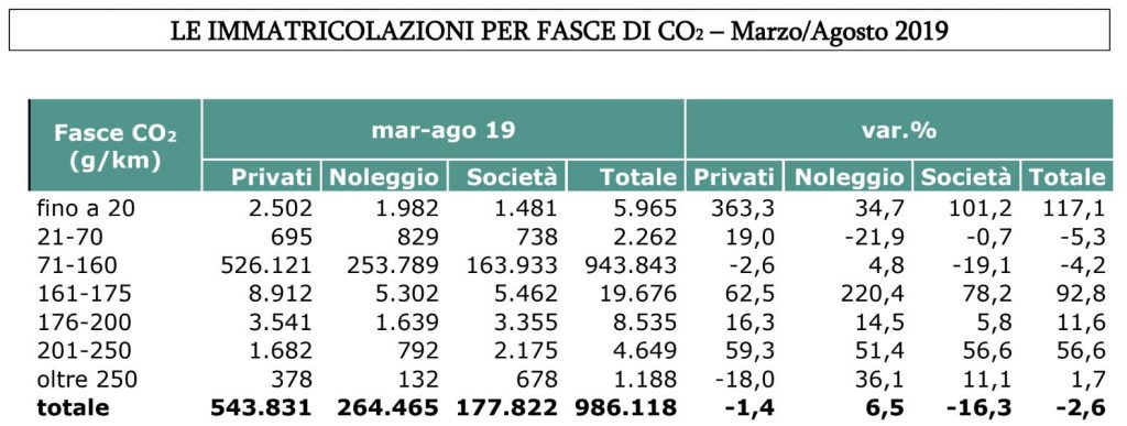 Prosegue la crescita della CO2 media ponderata che in agosto raggiunge i 118,9 g/km in aumento del 3% rispetto ai 115,4 di un anno fa. Negli 8 mesi l’incremento è del 5,5% a 119,8 g/km, rispetto ai 113,5 del gennaio-agosto 2018.