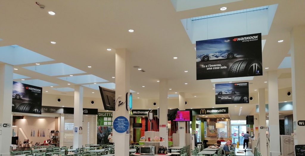 Grazie alla collaborazione di Ad Moving, concessionaria esclusiva dei mezzi pubblicitari di Autostrade per l’Italia Spa, di Autogrill e My Chef, operatori della ristorazione autostradale a livello nazionale, il marchio Hankook diventa protagonista del contesto, all’esterno ed all’interno delle tre aree di servizio, con formati tradizionali per 586 mq complessivi di esposizione.