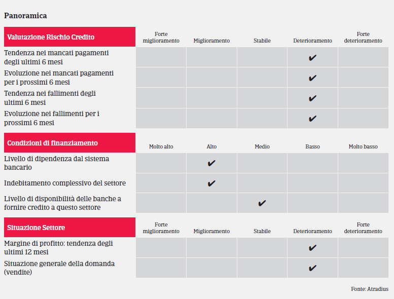 Vendite in sofferenza anche a livello globale (prevista una contrazione del 5% nei breve periodo) a causa della perdurante incertezza economica, che potrebbe agire da freno anche ad una eventuale ripresa nel 2020. Previsioni a più lungo raggio indicano un possibile aumento del rischio credito nel settore nei prossimi cinque anni. Le imprese del settore strutturalmente più deboli potrebbero risentire di pressioni sulla liquidità, dovute a maggiori rallentamenti delle tempistiche di pagamento delle fatture da parte dei clienti. E’ il caso, in particolare, degli operatori che forniscono componenti e ricambi a basso valore aggiunto, che spesso dipendono da un solo OEM (Original Equipment Manufacturer) e che operano in un contesto altamente competitivo.