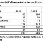 Entro i prossimi sette anni il fatturato mondiale dell’aftermarket automobilistico crescerà del 42,2%, passando dai 398 miliardi di euro stimati nel 2018 ai 566 miliardi stimati per il 2025. Questi dati derivano da un’elaborazione dell’Osservatorio Autopromotec sulla base di uno studio effettuato da Stern Stewart e Qvartz.