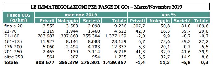Dall’analisi sulle immatricolazioni per fascia di CO2 elaborata dal Centro Studi e Statistiche UNRAE, per il periodo gennaio-novembre risultano ancora in aumento le vendite di autovetture nelle fasce che godono dell’Ecobonus: fino a 20 g/km CO2 con un incremento del 110% (oltre il 300% per i soli privati) e del 29% nella fascia 21-70 g/km, che complessivamente rappresentano meno dell’1% delle vendite.