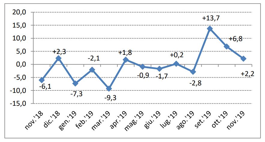 In controtendenza rispetto al dato mobile dei mesi precedenti, negli ultimi 12 mesi (dicembre 2018/novembre 2019) le immatricolazioni di autovetture recuperano lo 0,4% rispetto al periodo precedente (dicembre 2017/novembre 2018).