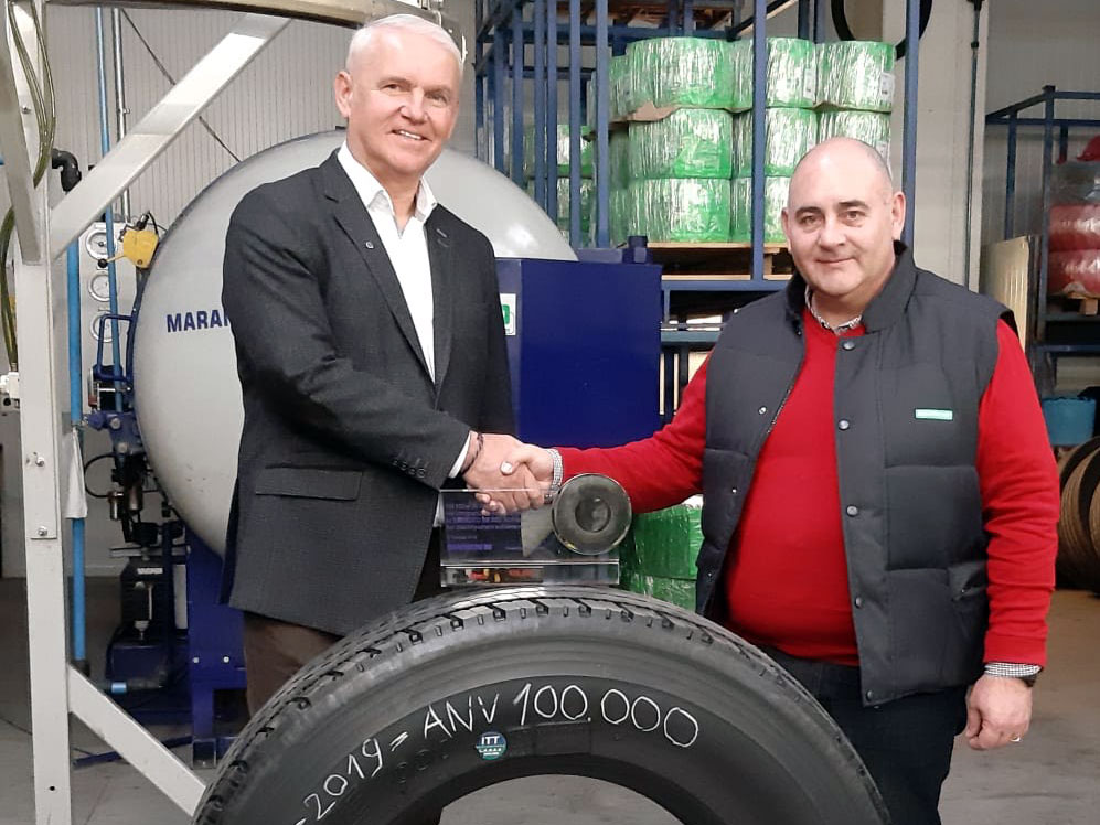 Marangoni ha festeggiato il 100.000° ricostruito prodotto nell’ottobre 2019 dal proprio partner PneuMaxx, con una targa celebrativa firmata dal Vice Presidente Giuseppe Marangoni.