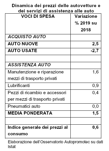| Modesta crescita (+1,5%) per i prezzi dell’assistenza auto 2019: crescono i prezzi delle auto nuove (+2,5%), cala l’usato (-2,7%) Nel 2019 i prezzi delle autovetture nuove in Italia sono aumentati mediamente del 2,5% rispetto al 2018. Si tratta di un aumento importante considerato che è superiore rispetto all’incremento fatto registrare dal tasso di inflazione (+0,6%). Alla crescita dei prezzi delle auto nuove si contrappone la diminuzione dei prezzi delle auto usate, che nell’anno che si è appena chiuso hanno visto un calo delle quotazioni del 2,7%. Sempre con riferimento al 2019, risultano in modesta crescita (+1,5%) i prezzi dei servizi per l’assistenza alle auto. Questi dati derivano da un’elaborazione degli indici Istat dei prezzi al consumo per l’intera collettività realizzata dall’Osservatorio Autopromotec. |