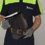 “La fascia, la visiera e il pezzo di rinforzo in basso sono in policarbonato. Queste protezioni possono essere sterilizzati con diverse modalità, senza degradarsi.”
