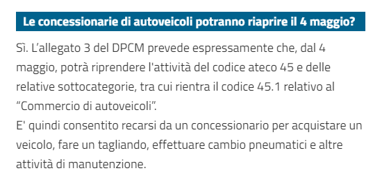 Risposta: Sì. L’allegato 3 del DPCM 26 aprile 2020 prevede espressamente che, dal 4 maggio, potrà riprendere l’attività del Codice Ateco 45 e delle relative sotto categorie, tra cui rientra il 45.1 relativo al “Commercio di autoveicoli”. E’ quindi consentito recarsi da un concessionario per acquistare un veicolo, fare un tagliando, effettuare cambio pneumatici ed altre attività di manutenzione.
