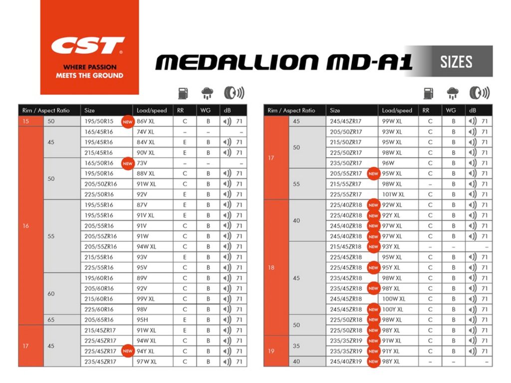 Secondo l’azienda, il CST Medallion MD-A1, grazie alla sua rinnovata mescola e alle moderne tecnologie di produzione, offre una ottima trazione sul bagnato, una bassa resistenza al rotolamento, prestazioni eccellenti e grande comfort. Il design chiuso delle scanalature presenti sulla spalla favorisce la silenziosità e il consumo omogeneo del pneumatico.