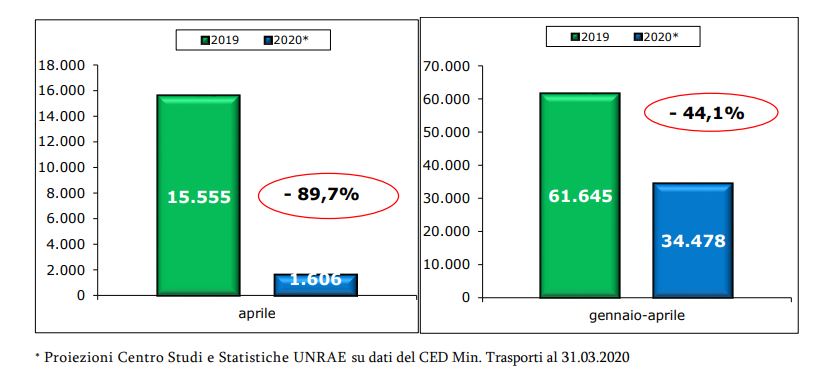 Il primo quadrimestre del 2020, dunque, archivia 34.478 immatricolazioni rispetto alle 61.645 dello stesso periodo dello scorso anno, in calo del 44%.