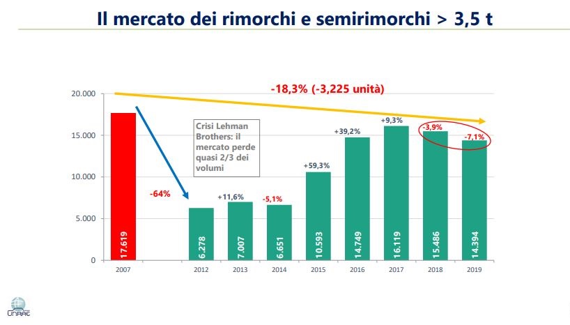L’andamento storico del mercato dei veicoli rimorchiati dimostra che la crisi del 2008 ha fatto perdere al settore quasi i due terzi del volume tra il 2007 e il 2012. La difficile ripresa che ne è seguita ha raggiunto il massimo nel 2017 (ma senza arrivare ai volumi del 2007), per poi ridiscendere nel 2018 (- 3,9%) e nel 2019 (- 7,1%), fino al crollo nei primi mesi del 2020 (il consolidato dei primi cinque mesi è stimato a –48,2%).