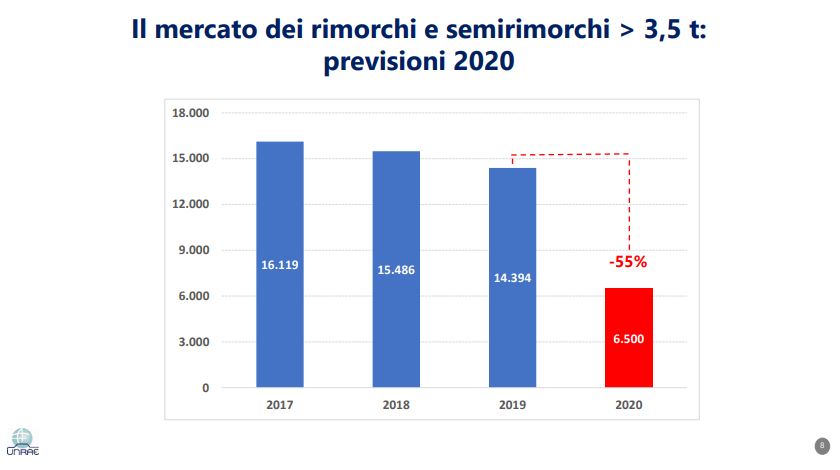 Il Centro Studi e Statistiche di UNRAE, l’Associazione delle Case estere, sulla base dei dati di immatricolazione forniti dal Ministero delle Infrastrutture e dei Trasporti, ha elaborato una stima del mercato dei Rimorchi e Semirimorchi con massa totale a terra superiore a 3,5t che – per il mese di marzo 2020 – indica una caduta di -70,2% rispetto ad aprile 2019 (602 unità immatricolate contro 2.019).