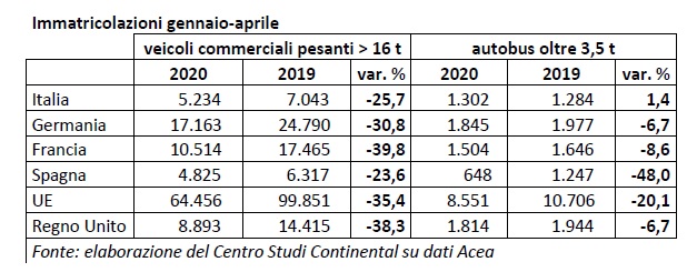 In Italia da gennaio ad aprile 2020 le immatricolazioni di veicoli commerciali pesanti (e cioè con PTT – peso totale a terra – di 16 tonnellate ed oltre) sono state 5.234, con un calo del 25,7% rispetto allo stesso periodo del 2019. Le immatricolazioni di autobus nel nostro paese, sempre nello stesso periodo, sono state 1.302, con un aumento dell’1,4% rispetto allo stesso periodo dell’anno precedente. Questi dati sono stati elaborati da Acea (l’associazione europea dei costruttori automobilistici) e sono resi noti dal Centro Studi Continental.