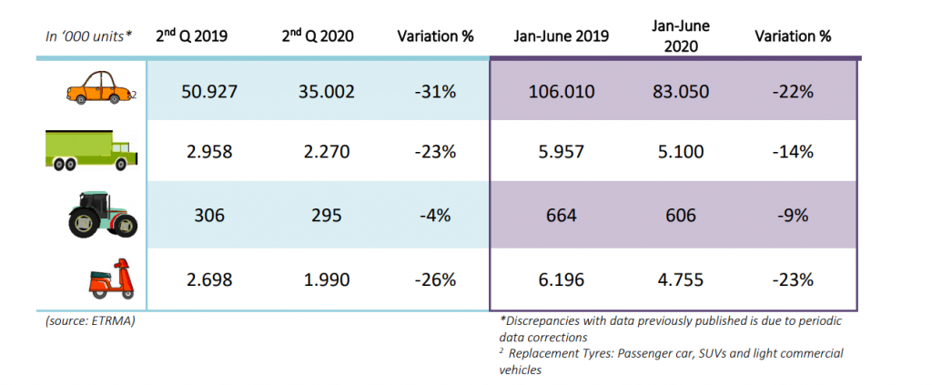 L’Associazione europea dei produttori di pneumatici e gomma (ETRMA) ha pubblicato i dati di vendita dei pneumatici di sostituzione dei suoi membri per il secondo trimestre e per il primo semestre del 2020.