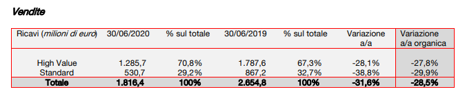 - ricavi pari a 1.816,4 milioni di euro, in flessione del 31,6% rispetto al primo semestre 2019 (-28,5% la variazione organica) per effetto del citato calo della domanda. I ricavi High Value sonostati pari al 70,8% del totale (+3,5 punti percentuali rispetto al 67,3% del primo semestre 2019);