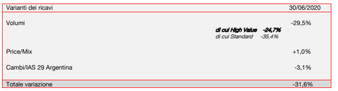 I ricavi sono stati pari a 1.816,4 milioni di euro, con una flessione del 31,6% rispetto al primo semestre. Escludendo l’effetto dei cambi e l’adozione del principio contabile IAS 29 per tener conto dell’alta inflazione in Argentina (per un impatto complessivo pari a -3,1%), la variazione organica dei ricavi è stata pari a -28,5%.