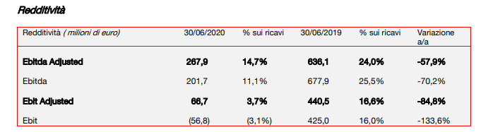 L’ Ebitda, pari a 201,7 milioni di euro (677,9 milioni di euro nel primo semestre 2019), comprende anche costi diretti operativi legati all’emergenza Covid-19 per 26,4 milioni di euro relativi a costi sostenuti per