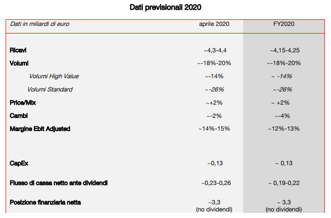 - il piano di contenimento costi “Azioni Covid”, comprensivo di azioni a breve su SG&A, marketing e comunicazione, manufacturing e R&D, contribuisce per circa 120 milioni di euro, 30 milioni di euro al netto dello slowdown produttivo (il cui impatto è confermato pari a -90 milioni di euro).