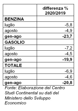 Da gennaio ad agosto 2020 le emissioni di CO2 derivate dall’uso di benzina e gasolio per autotrazione sono diminuite del 20,8% rispetto allo stesso periodo del 2019. Nel solo mese di luglio il calo è stato del 6,9% rispetto allo stesso mese dell’anno precedente, mentre nel mese di agosto il calo è stato del 4,6%. Questi dati emergono da un’elaborazione del Centro Studi Continental su dati Aci.