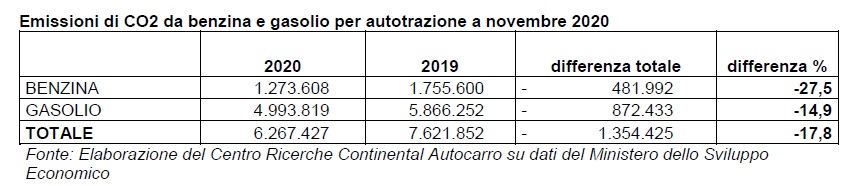 A novembre 2020 le emissioni di CO2 da benzina e gasolio per autotrazione sono calate del 17,8%