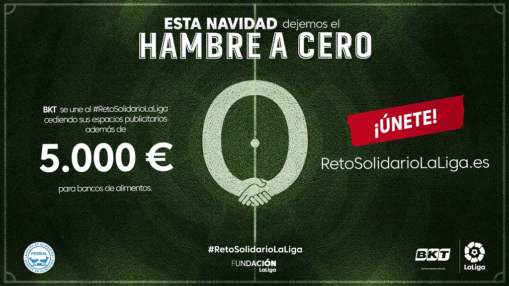 BKT, Official Global Partner de LaLiga, ha aderito a questa iniziativa donando alla causa 5000 € e mettendo a disposizione lo scorso dicembre, durante la 18esima e 19esima giornata del campionato de La Liga, 1 minuto di visibilità sui LED a bordo campo per incentivare i tifosi ad aderire all’iniziativa donando anche solo pochi euro per aiutare chi più ne ha bisogno.