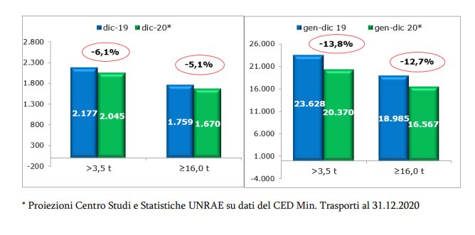 L’intero 2020 denuncia così un calo consolidato di -13,8% rispetto al 2019 (20.370 immatricolazioni contro 23.628). Nel comparto dei veicoli pesanti, con massa totale a terra uguale o superiore alle 16t, la perdita del mercato a dicembre fa registrare –5,1% su dicembre 2019 (1.670 unità immatricolate contro 1.759), che porta il risultato del comparto per il 2020 a –12,7% sullo stesso periodo del 2019 (16.567 immatricolazioni contro 18.985).