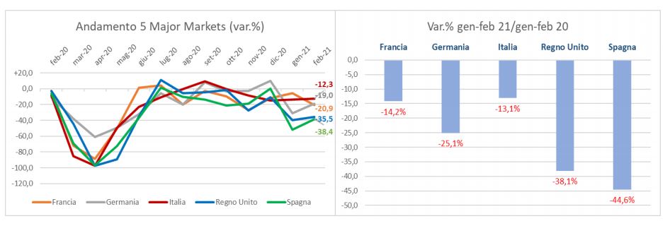 Il mercato europeo dell’auto (UE+UK+EFTA) è ancora in perdita anche nel mese di febbraio, e con 850.170 immatricolazioni rispetto a 1.066.172 dello stesso mese 2020 registra una flessione del 20,3%. Nel cumulato dei primi due mesi la perdita sale al -23,1% (1.693.059 unità). Le contrazioni più pesanti fra i major markets riguardano Spagna (-38,4%) e Regno Unito (-35,5%), ma il record negativo è del Portogallo (-59%). L’Italia, grazie agli incentivi, presenta ancora il calo più limitato fra i mercati più grandi (-12,3%), superata sia dalla Germania (-19%) che dalla Francia (-20,9%).