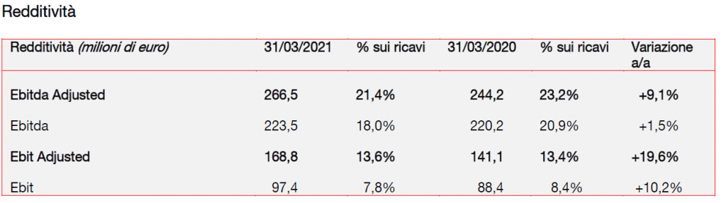 L’Ebit adjusted nel primo trimestre 2021 è stato pari a 168,8 milioni di euro, in crescita del +19,6% rispetto ai 141,1 milioni del corrispondente periodo 2020, con un margine Ebit adjusted pari al 13,6% rispetto al 13,4% del primo trimestre 2020 (>14% ÷ ~15% il target 2021) grazie al miglioramento delle leve interne (volumi, price/mix, efficienze) che ha più che compensato le negatività dello scenario esterno (materie prime, inflazione, impatto cambi).