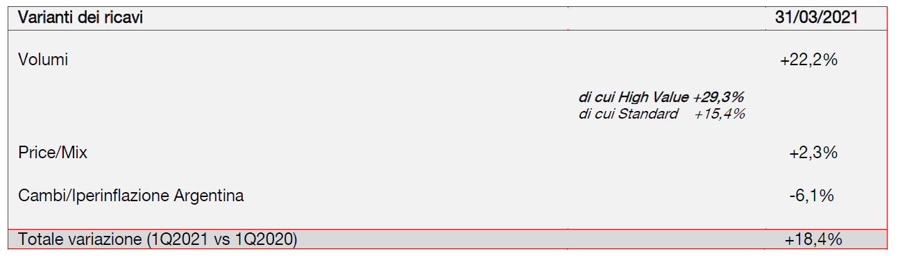 I ricavi sono stati pari a 1.244,7 milioni di euro, in crescita del 18,4% rispetto al primo trimestre 2020 (~+10% ÷ ~ +12% il target 2021), grazie alla ripresa della domanda nelle principali aree geografiche con un rafforzamento della quota di mercato nei principali segmenti. La crescita organica dei ricavi è stata pari a +24,5% (-6,1% l’impatto derivante dai cambi/iperinflazione Argentina). L’High Value raggiunge il 72,6% del fatturato di gruppo (+3 punti percentuali rispetto al 69,6% nel primo trimestre 2020).