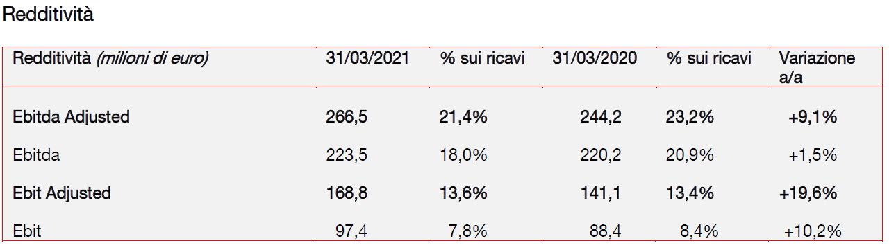 L’Ebit adjusted nel primo trimestre 2021 è stato pari a 168,8 milioni di euro, in crescita del +19,6% rispetto ai 141,1 milioni del corrispondente periodo 2020, con un margine Ebit adjusted pari al 13,6% rispetto al 13,4% del primo trimestre 2020 (>14% ÷ ~15% il target 2021) grazie al miglioramento delle leve interne (volumi, price/mix, efficienze) che ha più che compensato le negatività dello scenario esterno (materie prime, inflazione, impatto cambi).