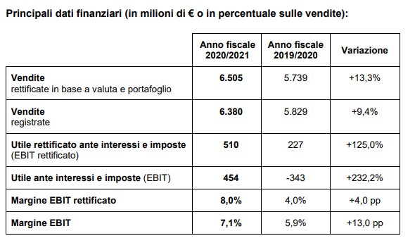 Considerando fattori straordinari, l’utile ante interessi e imposte (EBIT) registrato ammonta a 454 milioni di euro (anno precedente: € -343 milioni). Nell’anno precedente, il valore era stato ulteriormente gravato da svalutazioni non monetarie non pianificate. Il margine EBIT registrato è salito al 7,1% nell’ultimo anno fiscale (anno precedente: -5,9 percento).